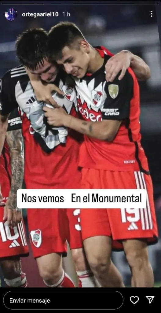 Luego de la dura derrota del Millonario en Brasil, Ariel Ortega, ídolo de la institución, público en su cuenta de Instagram una historia con el texto “Nos vemos en el Monumental” y de fondo una foto de los ambos juveniles de River abrazados.