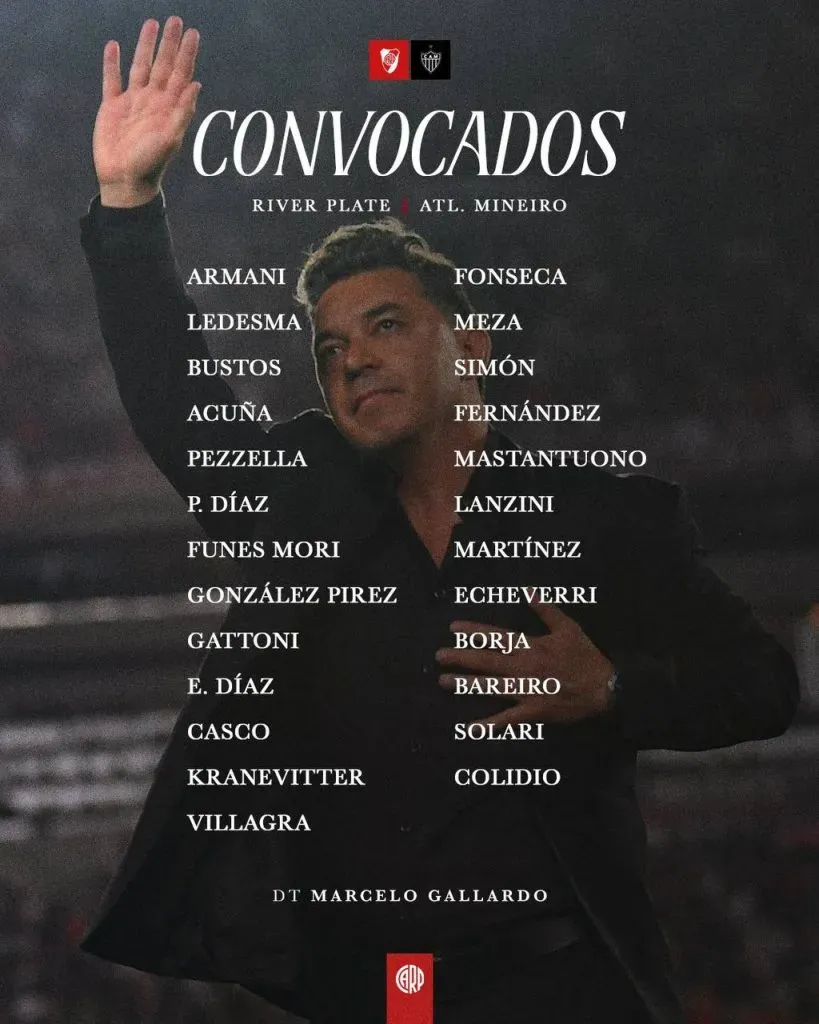 River va por la épica y Marcelo Gallardo ya eligió a los soldados que conformarán su tropa para la Batalla de Núñez. El Muñeco confirmó la lista de convocados para la revancha de semifinales de Copa Libertadores de este martes contra Atlético Mineiro.