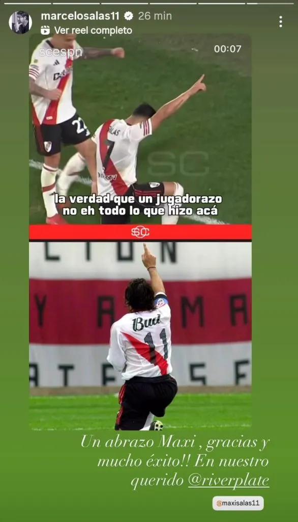 Este lunes, el chileno le agradeció el gesto a través de una historia en su cuenta oficial de Instagram. “Un abrazo Maxi, gracias y mucho éxito en nuestro querido River”, escribió el ex goleador, junto al video que pone en planos distintos pero simultáneos los festejos de los dos Salas, con 20 años de diferencia.