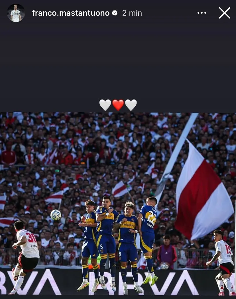 Con apenas 17 años, Mastan fue protagonista del último superclásico marcando un gol de antología por encima de la barrera para darle la victoria a River contra el equipo comandado por Fernando Gago en ese entonces. Además de la foto, Mastantuono puso tres emojis encima de ella: dos corazones blancos y uno rojo, formando la banda de River. Llamativamente, a los pocos minutos borró el posteo.