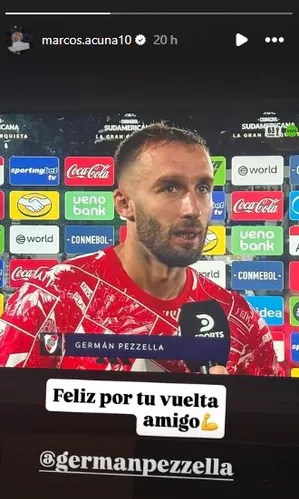 Uno de ellos fue Marcos Acuña, quien compartió una historia de Instagram con un mensaje para el defensor. El Huevo compartió una imagen del momento en que Germán hablaba tras el partido y escribió “Feliz por tu vuelta amigo” junto a un emoticono de un músculo, el mismo que utilizó para comentar el posteo que el central hizo en su cuenta personal.