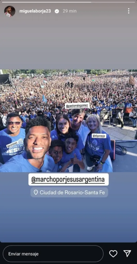 Borja compartió en sus redes sociales una fotografía de él con su familia y el pastor Ale Gómez. El delantero colombiano participó de la movilización el lunes junto a su esposa y sus dos hijos, quienes subieron al escenario para expresar algunas palabras frente al público que fue convocado mediante la fe.