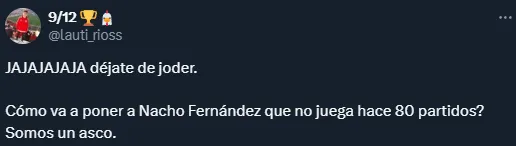 Ante las diferentes opciones que tiene a su disposición, el Muñeco venía optando por no darle minutos a Nacho. No obstante, y para buscar romper el cero ante Deportivo Riestra, el DT le dio minutos este sábado. Esta decisión generó gran fastidio entre los hinchas, principalmente con el mediocampista, aunque también con Gallardo.