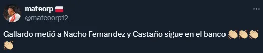 Claro está que este cambio también hizo que Gallardo recibiera críticas. Resulta que con la llegada de Castaño y el buen presente de Santiago Lencina, quien no fue siquiera convocado, los hinchas esperan por la aparición de caras nuevas. Sin embargo, el DT volvió a optar por Nacho, que no jugaba desde la tercera fecha.