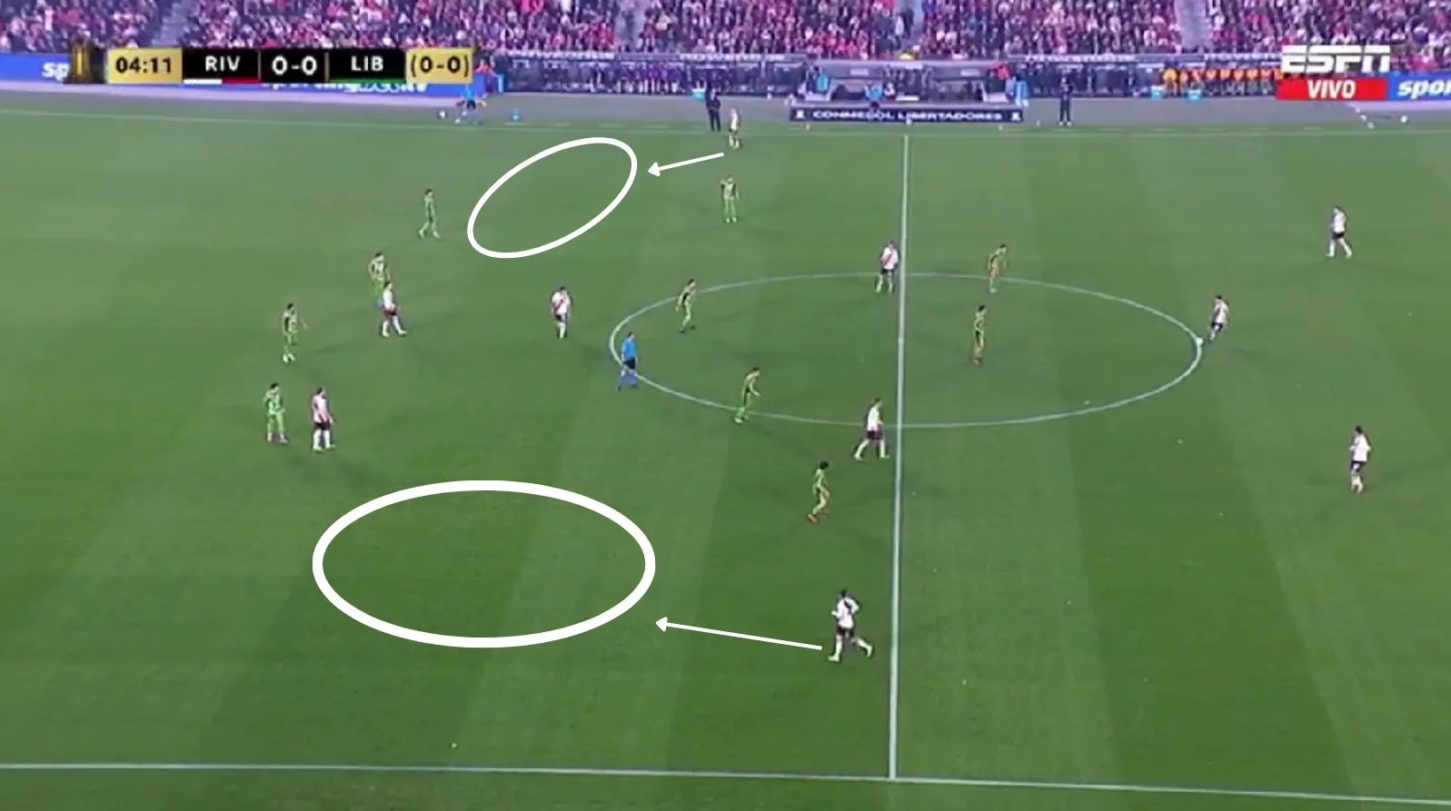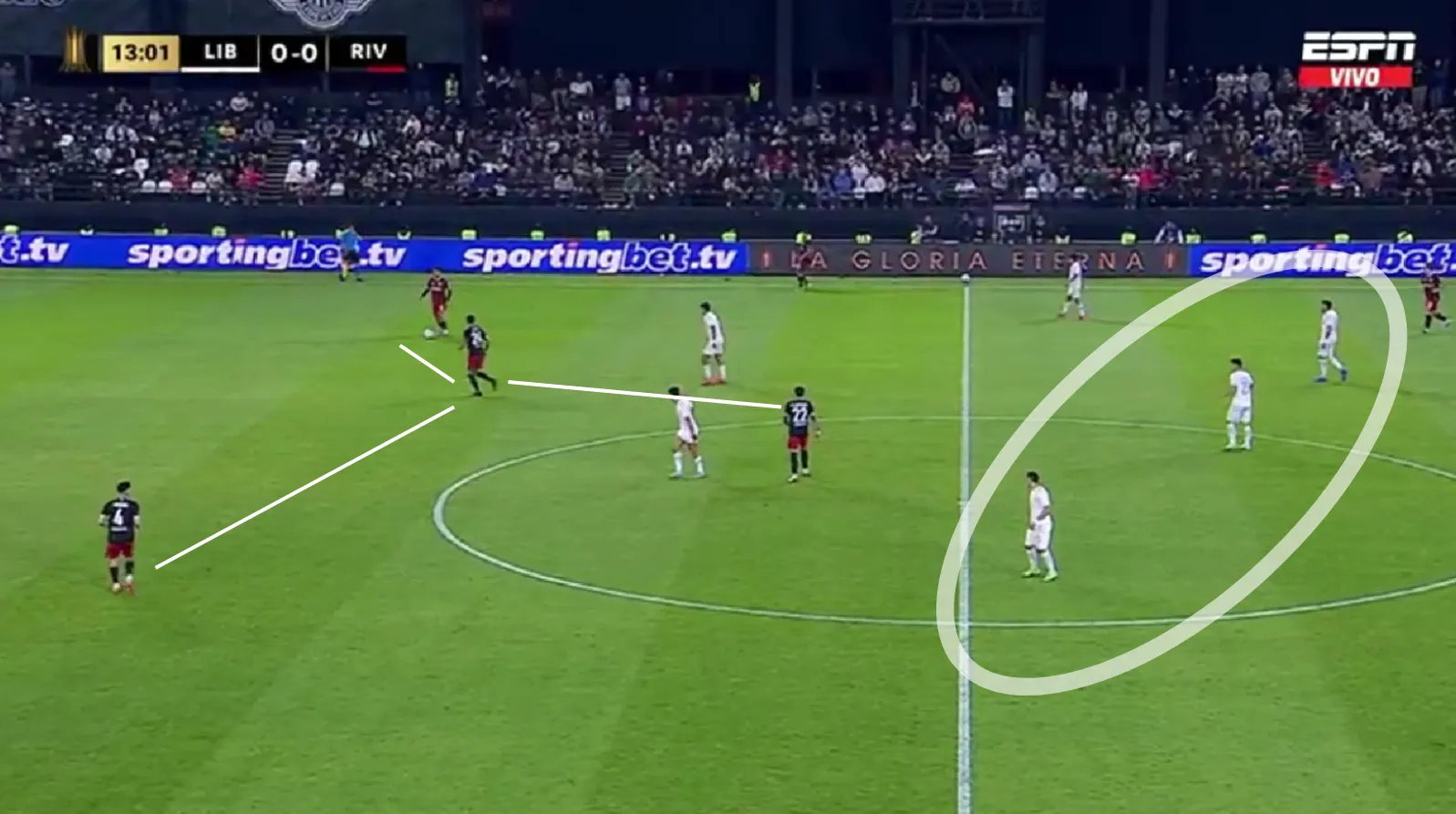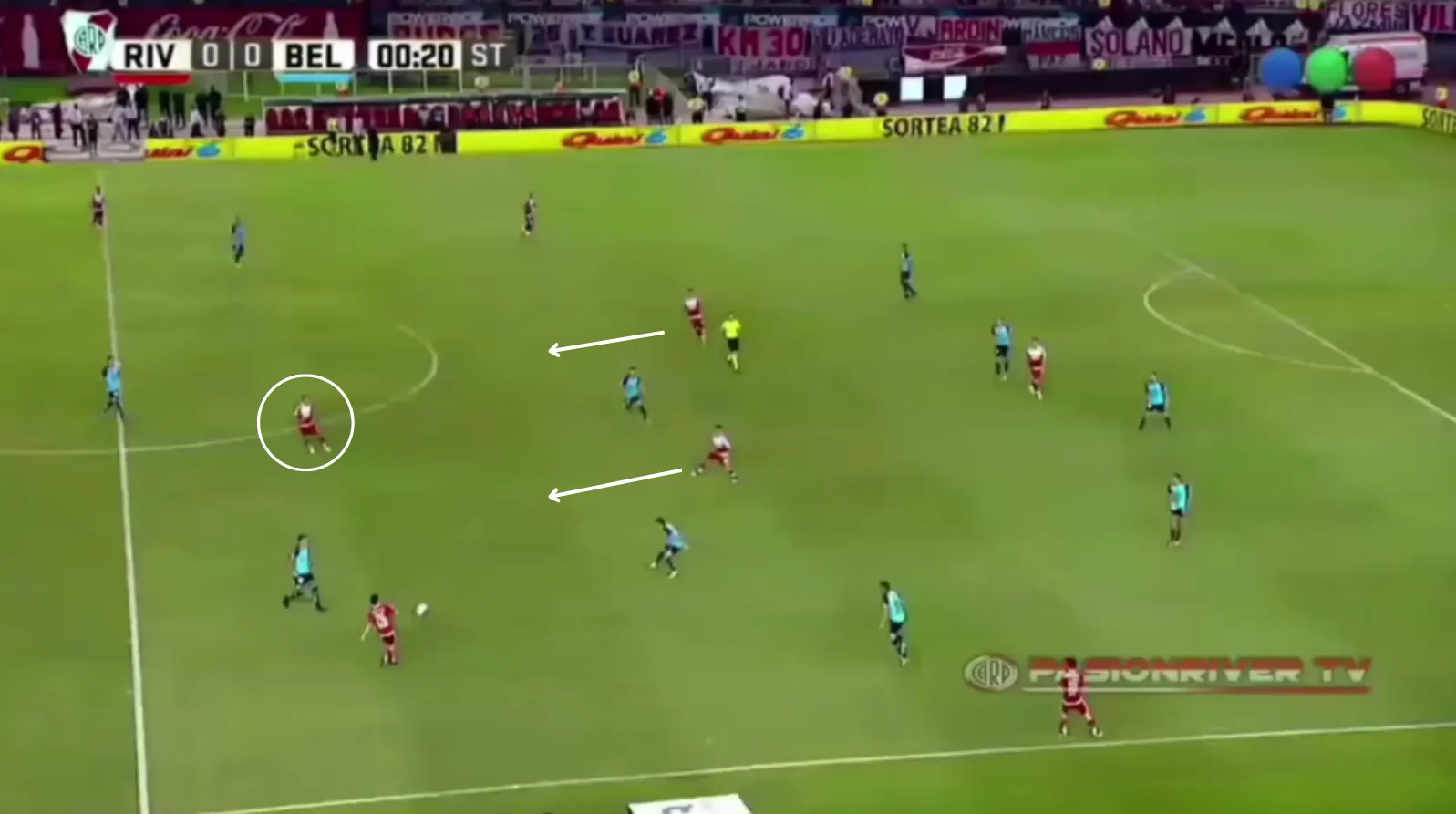 El mejor River del ciclo se organizaba con la pelota. Asociación, apoyos constantes, movilidad, triangulaciones y defensa desde la presión tras pérdida eran sellos claros. El bloque era corto, la circulación tenía densidad y cada jugador ofrecía líneas de pase.