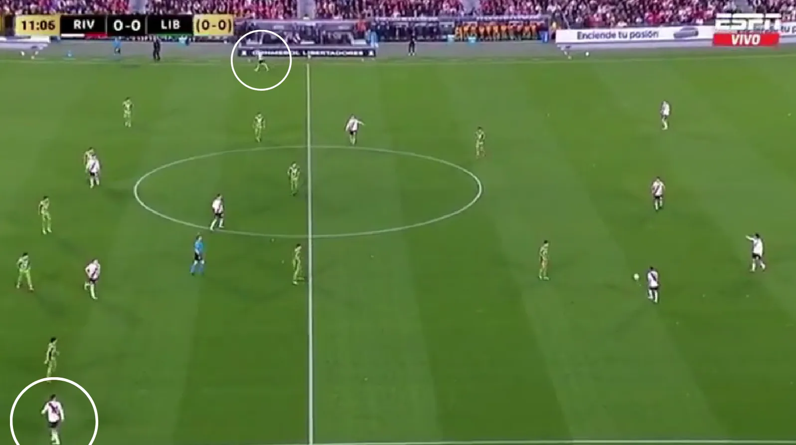 Algo similar a lo que sucedió con los espacios: excederse en la amplitud que brindan los laterales, lanzar desde el fondo y descartar el mediocampo. Esto pasa siempre cuando Acuña y Montiel están presentes como los laterales titulares del equipo, aunque también lo hemos visto con Fabricio Bustos.