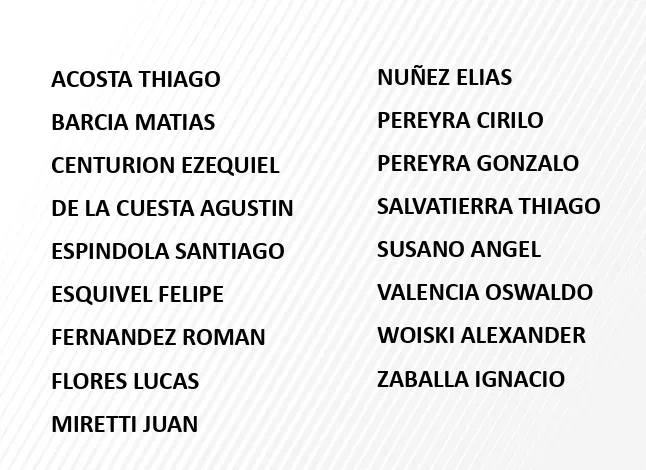 Volantes: Agustín De la Cuesta, Thiago Acosta, Santiago Espíndola, Elías Nuñez, Ángel Susano, Ignacio Zaballa y Román Fernández.