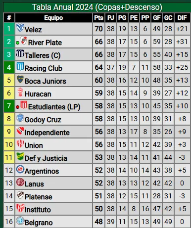 | 15 | Estudiantes (LP) | 31 | 24 | 7 | 10 | 7 | 26 | 26 | 0 |