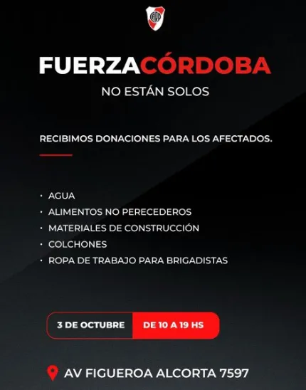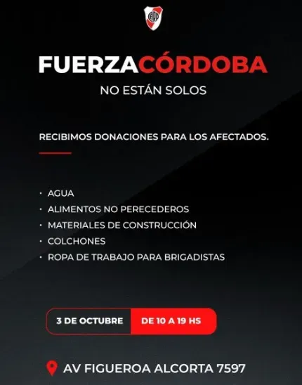 Desde River avisaron que las colaboraciones serán recibidas en la Avenida Figueroa Alcorta, en la entrada del club desde las 10 hasta las 19hs. El Millonario publicó un aviso en sus redes sociales con la frase “Fuerza Córdoba” bajo el lema de “No están solos”.