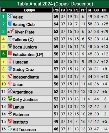 | 7 | Atl Tucuman | 36 | 23 | 10 | 6 | 7 | 25 | 24 | +1 |