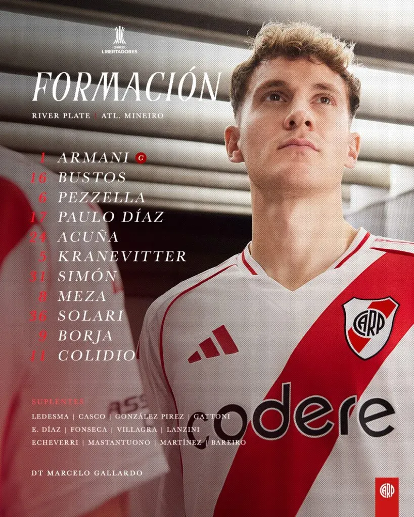 Los once titulares elegidos por Gallardo vs. Mineiro son: Franco Armani; Fabricio Bustos, Germán Pezzella, Paulo Díaz, Marcos Acuña; Matías Kranevitter, Santiago Simón, Maximiliano Meza, Pablo Solari, Miguel Borja y Facundo Colidio.
