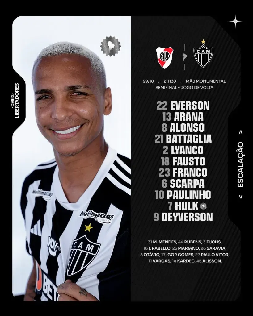 Gabriel Milito también definió la formación de Mineiro: Everson; Lyanco, Rodrigo Battaglia, Júnior Alonso; Gustavo Scarpa, Fausto Vera, Alan Franco, Guillerme Arana; Hulk, Deyverson y Paulinho.