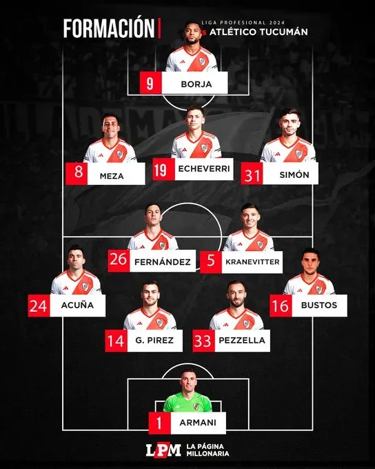 Marcelo Gallardo confirmó los titulares de River frente a Atlético Tucumán: Franco Armani; Fabricio Bustos, Germán Pezzella, Leandro González Pírez, Marcos Acuña; Santiago Simón, Matías Kranevitter, Maximiliano Meza; Claudio Echeverri, Nacho Fernández; y Miguel Borja.