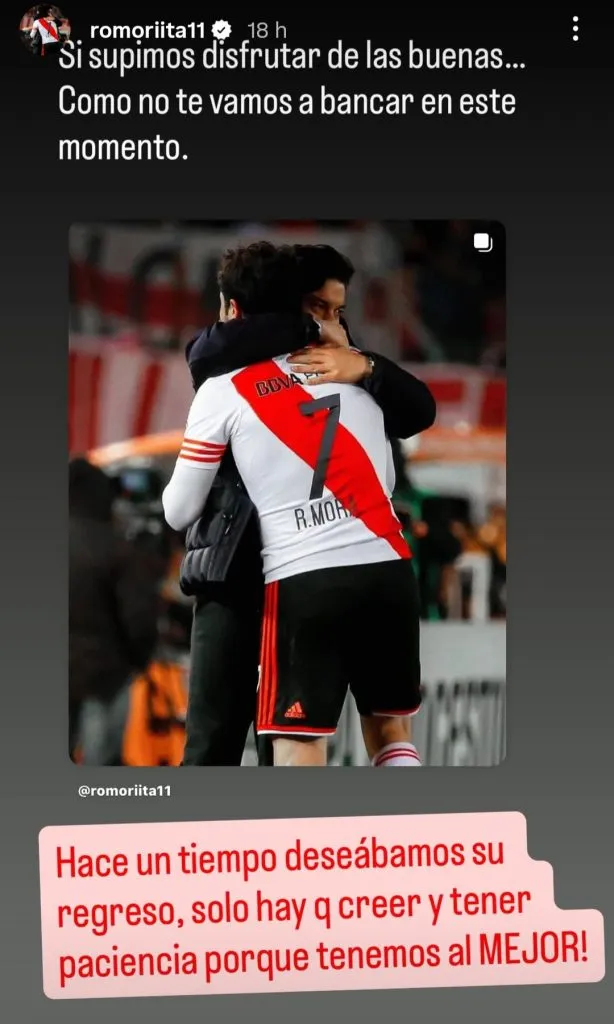 En este escenario totalmente adverso, el DT del Más Grande recibió el apoyo de uno de sus ex dirigidos. Se trató del uruguayo Rodrigo Mora, quien a través de su cuenta personal de Instagram lo bancó con un mensaje en el que le pidió a los hinchas “creer y tener paciencia”.