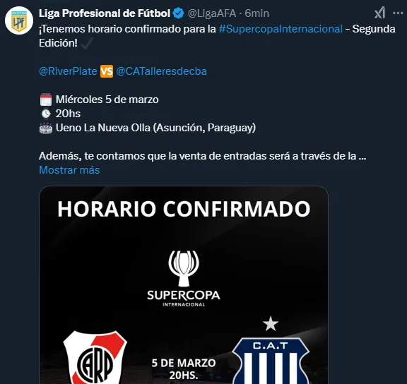 Horario confirmado para la Supercopa River vs. Talleres