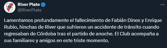 “Lamentamos profundamente el fallecimiento de Fabián Dines y Enrique Rubio, hinchas de River que sufrieron un accidente de tránsito cuando regresaban de Córdoba tras el partido de anoche. El Club acompaña a sus familiares y amigos en este triste momento“.