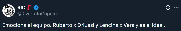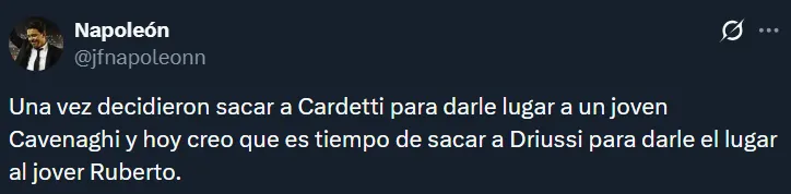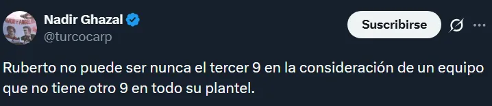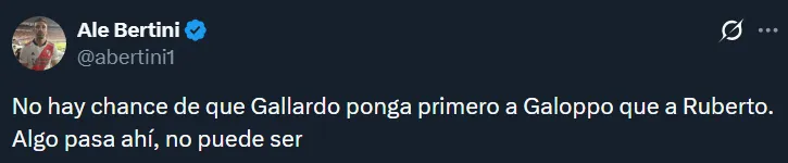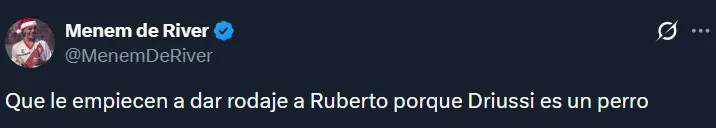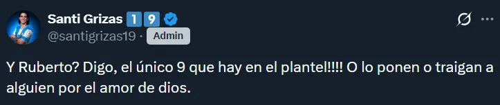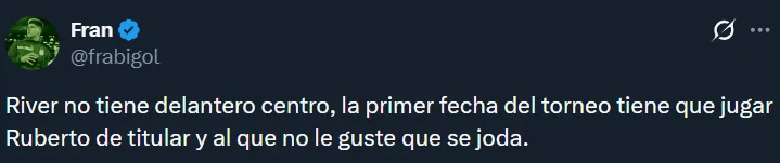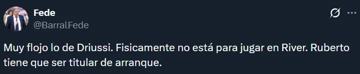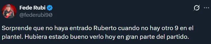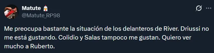 A raíz de la floja actuación de los tres mencionados, en las redes sociales hubo numerosos pedidos por Agustín Ruberto. Resulta que el joven es el único centrodelantero natural que tiene el plantel, pero Gallardo ha preferido hasta ahora probar con Salas, Driussi y Colidio. Esto último generó ciertos cuestionamientos.
