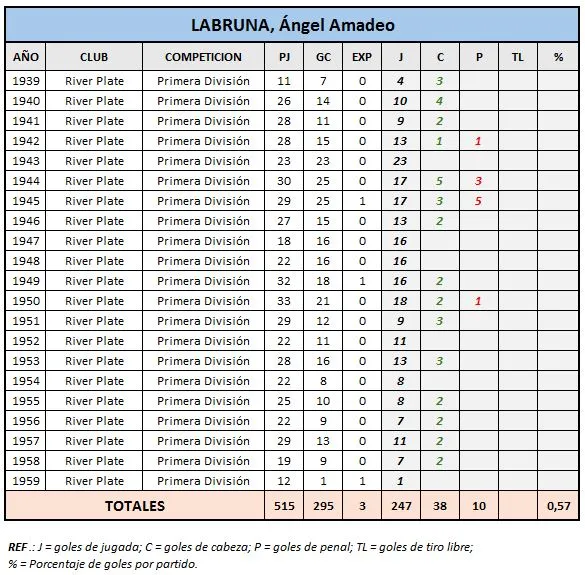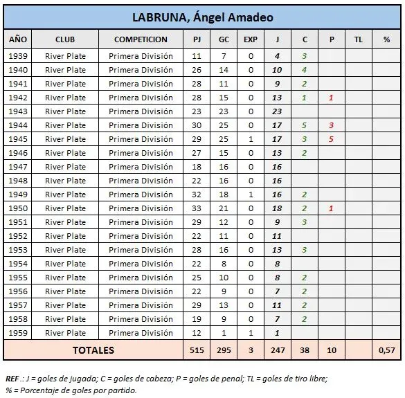 Según una investigación del Centro para la Investigación de la Historia del Fútbol (CIHF), Labruna marcó 295 goles, todos con la camiseta de River, en el fútbol doméstico. Así, supera por dos tantos al delantero de Independiente, que registra 293, todos con la del club de Avellaneda.