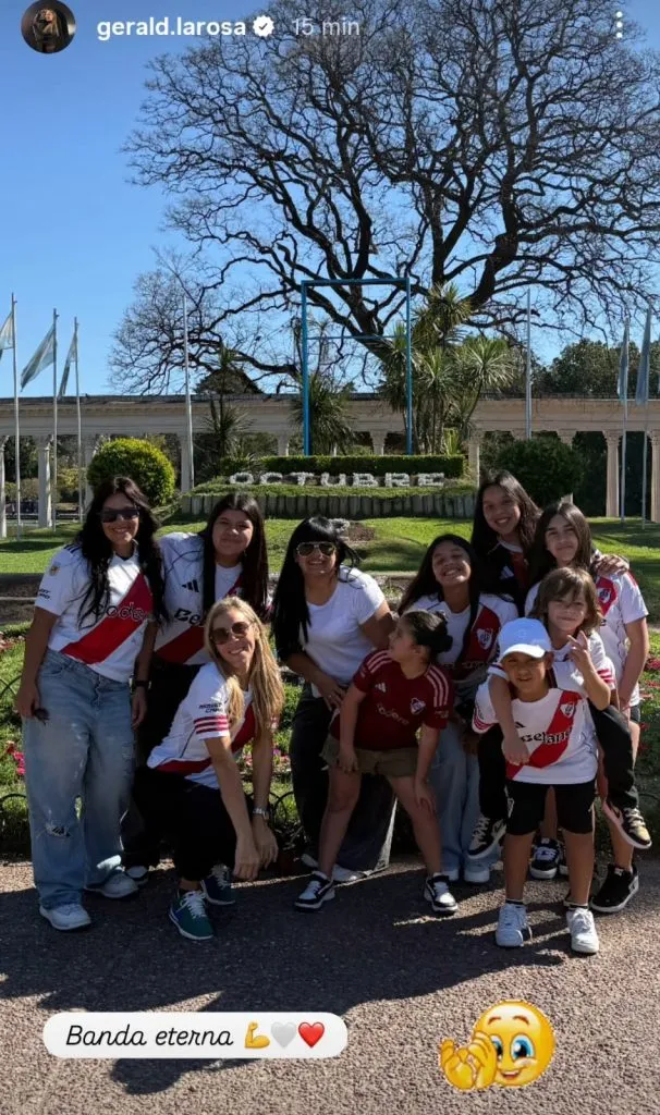 Y fue justamente la mujer de Gallardo la que acreditó la presencia del grupo familiar con una imagn de todos unidos y la mayoría de ellos con la camiseta de River, con una inscripción contundente: “Banda eterna”, escribió.