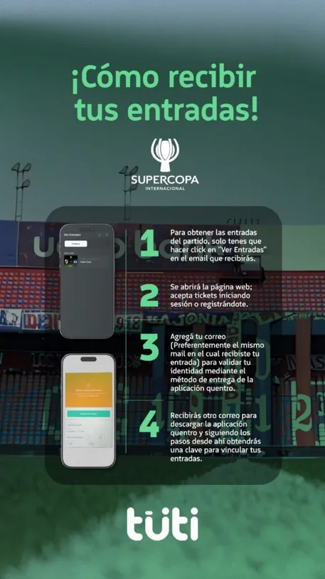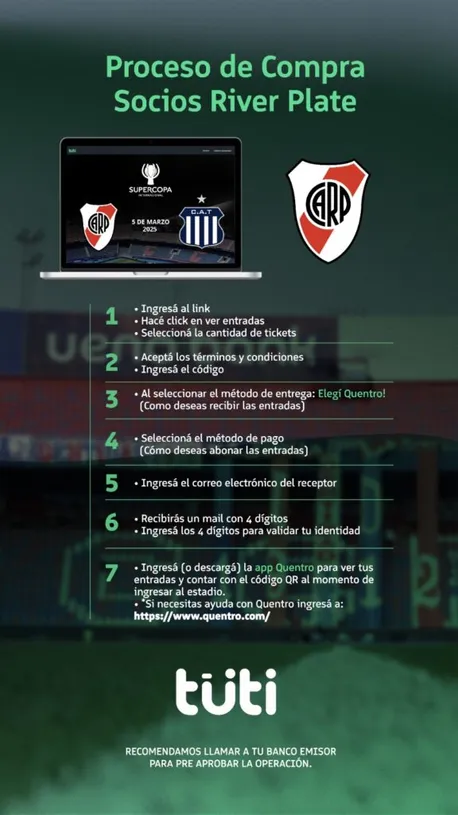 Los tickets deberán adquirirse a través de Tuti. Aquellos hinchas que quieran comprar entradas, primero deberán obtener un código en RiverID y, a partir de allí, ingresar a Tuti. Por su parte, los boletos serán virtuales, y estarán disponibles en la plataforma Quentro. A continuación, el paso a paso para comprar las entradas.