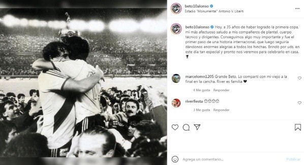 “Hoy, a 35 años de haber logrado la primera copa, mi más afectuoso saludo a mis compañeros de plantel, cuerpo técnico y dirigentes. Conseguimos algo muy importante y fue el primer paso de una historia internacional, que luego seguiría dándonos enormes alegrias a todos los hinchas. Brindo por uds. en este día tan especial y pronto nos veremos para celebrarlo en casa”, publicó el prócer riverplatense en su cuenta de Instagram. Cuando se refiere a la posibilidad de celebrarlo junto a los hinchas en el Monumental se refiere al homenaje que preparó la dirigencia para reconocer al plantel del 86 en la previa al duelo ante Patronato el próximo domingo 7 de noviembre.