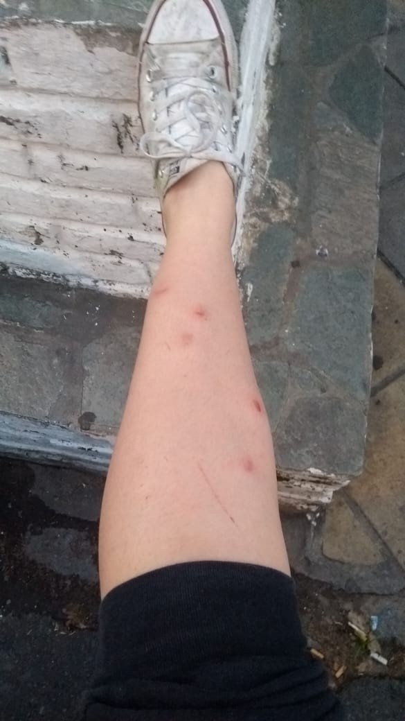 Alrededor de 70hinchas con entradas falsas intentaron ingresar y ahí se desató la pesadilla. Sí, porque el operativo policial no pudo controlar bien una situación con 70 personas. Y empezaron los palazos y las balas de goma para todos. Para todos. Una chica de 14 años, sí 14 años, fue reprimida por la policía, un familiarsalió a defenderla (es el hombre que se ve en el video de ESPN golpeado mientras es llevado por tres policías), y las marcas en su pierna hablan por sí solas.