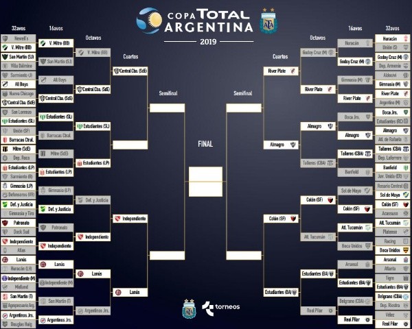 De un lado de la llave, figuran River-Almagro yColón -Estudiantes (Buenos Aires). Y del otro, se encuentran Central Córdoba, a la espera de lo que suceda hoy entre Estudiantes de La Plata – Estudiantes (San Luis); y Lanús – Independiente.