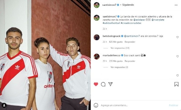 Se sabe que el Beto es chicanero en las redes, que siempre que ve un detalle de alguna publicación que le llama la atención no tiene problemas en exponer a su compañero. En esta oportunidad su víctima fue Santiago Simón. El juvenil –de gran presente en River y flamante convocatoria a la Selección Argentina- compartió en su cuenta de Instagram una foto con la camiseta retro que sacó Adidas de River –un homenaje a la del 86- y en la misma se lo veía a Simón junto a Martina Del Trecco y Benjamín Rollheiser. Al Beto le llamó la atención la seriedad de Simón y le escribió: “@santisimon7 era sin sonrisa? Jaja”