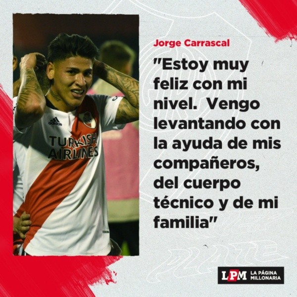 Al volante le venía costando meterse a los hinchas en el bolsillo pero desde hace ya varios partidos que viene en levantada: “Estoy muy feliz por convertir el gol, para eso trabajamos y nos esforzamos cada a día. Otra vez se me dio la suerte de marcary estoy muy contento por el equipo” declaró Carrásca una vez finalizado el encuentro. Y agregó, sobre lo que le pidió Gallardo: “La estrategia un poco del entrenador era que me moviera y recibiera solo y pude hacerlo, con ayuda del profe que me dijo que tratara de aparecer por todos lados”.