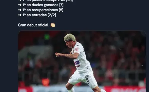 El volante jugó casi todo el partido (fue reemplazado en tiempo de descuento) y su gran actuación se vio traducida en los números. Fue el que más gambetas completó (4/5),más pases dio a campo rival (23),más duelos ganó (7), más pelotas recuperó (8 y estadística llamativa para un jugador de sus características)y también primero en entradas (2/2). ¡Chapeau!