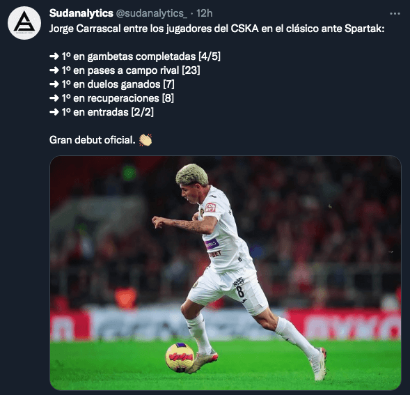 El colombiano fue titular con la camiseta número 8 y jugó como volante, en los primeros minutos por izquierda y luego se fue tirando hacia la derecha. El CSKA ganó el derbi ruso por 2-0 y Carrásca fue la figura de la cancha. Se lo vio suelto, con mucha confianza para encarar a los rivales y sobre todo con ganas de sobresalir.Durante todo el partido mostró su repertorio de gambetas, recortes hacia adentro, corridas al espacio, recuperaciones y hasta se dio el lujo de tirar un caño, de taco ¡y de espaldas!