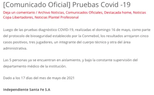 El escrito enuncia que tras los hisopados que se le realizaron a la delegación el pasado domingo 16 de mayo, tres jugadores del plantel profesional, un intregrante del cuerpo técnico y una persona del área adminsitrativa arrojaron positivo de Covid-19, sin haber revelado los nombres. Además, Santa Fe tampoco publicó la lista de convocados para el partido con el Millonario y no se sabe quienes son los tres futbolistas que no estarán presentes.