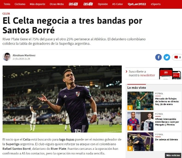 El gran presente de Rafael Santos Borré, uno de los goleadores de la Superliga, despertó el interés de equipos europeos en el cierre del mercado de pases del viejo continente, que será el próximo viernes. Es que, según informa el diario AS, Celta de Vigo está interesado en negociar por el colombiano de River, y mencionan que ya hubo contactos entre ambos clubes.