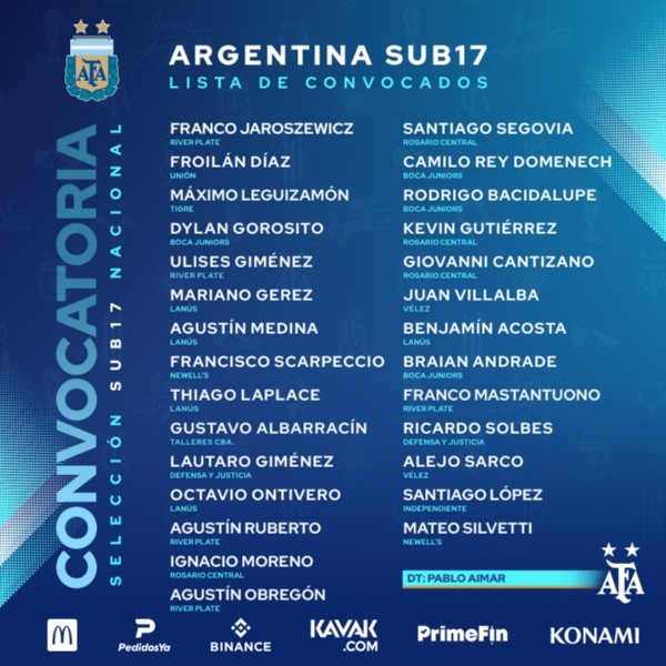 Pablo Aimar dio a conocer la nómina de convocados para trabajar junto a la Selecicón Sub17 y hay cinco juveniles del Más Grande.¿De quiénes se trata? Franco Jarosewicz (arquero), Ulises Giménez (defensor), Agustín Obregón (mediocampista), Agustín Ruberto (delantero) –todos categoría 2006- y Franco Mastantuono (enganche), que es un año menor al resto (2007).