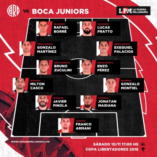 Es por eso que los jugadores que tendrían su lugar confirmado para el primer duelo ante el eterno rival son: Franco Armani, Gonzalo Montiel, Jonatan Maidana, Javier Pinola, Milton Casco, Exequiel Palacios, Gonzalo Martínez, Rafael Borré y Lucas Pratto.