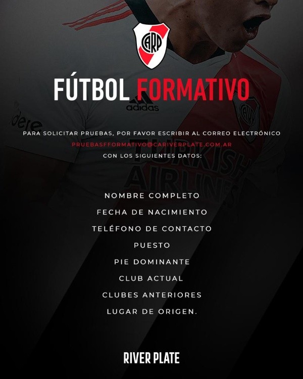 En el cuerpo del mensaje deberás completar los datos personales del juvenil que se postula para jugaren River: nombre completo, fecha de nacimiento, teléfono de contacto, puesto, pie dominante, club actual, clubes anteriores y lugar de origen.