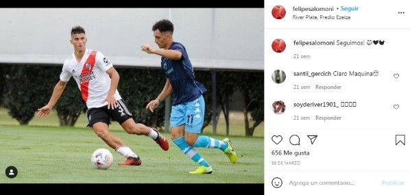De los integrantes de la lista de convocados es el único que todavía no debutó en Primera. Salomoni nació el 28 de marzo de 2003 en Vicente López, llegó a River en 2014 de la mano de Gabriel Rodríguez proveniente de Parque Chas. Su primer club fue Defensores de Olivos, donde jugaba de volante izquierdo. Estuvo entrenando con Primera en la semana (fue subido por Gallardo junto a Román Suárez). En Reserva debutó como lateral por izquierda, jugó de doble 5, de enganche y hasta de marcador central en juveniles, pero la mayor parte de su estadía en divisiones juveniles fue volante por izquierda. Entre sus principales características se destacan la dinámica, potencia física, buena pegada de larga distancia y maneja bien la pierna diestra, teniendo en cuenta que es zurdo.