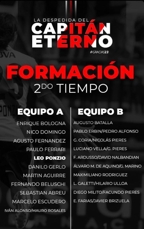 En el primer equipo y con la camiseta de River estarán agrupados los campeones de la Libertadores de 2015 junto con Francescoli, Leo Astrada, el Burrito Ortega y quizás Marcelo Gallardo. En frente y con camiseta roja aparecerán los campeones de 2018 en Madrid, con el Cabezón D’Alessandro, Hernán Díaz y el Chori Domínguez como refuerzos estelares. En el segundo tiempo habrá muchos cambios en ambas formaciones y jugarán todas las figuras y amigos de Ponzio invitados.