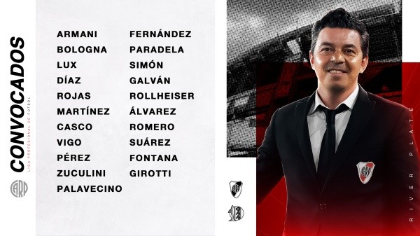 Gallardo ya sabe que a partir de la semana que viene, Franco Armani, Julián Álvarez, David Martínez, Robert Rojas, Nicolás De la Cruz y Paulo Díaz se irán a la concentración con sus respectivas selecciones. La dirigencia solicitó de manera formal a la AFA la postergación de los partidos con Sarmiento -próximo lunes- e Independiente -posiblemente domingo 5 de septiembre- pero el mismo será denegado y el entrenador deberá hacer malabares para armar el equipo con muchísimas bajas.