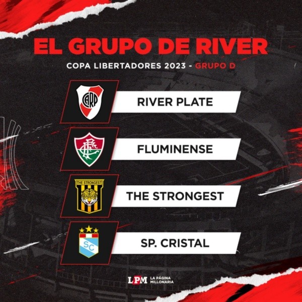Los dirigidos por Martín Demichelis integrarán el Grupo D y deberá enfrentar a Fluminense, The Strongest y Sporting Cristal, sus rivales en la fase de grupos de la Copa Libertadores. Ya habiendo conocido sus contrincantes y las distancias que deberá recorrer en este tramo inicial, el Más Grande comenzará a competir con un calendario apretado y sin demasiado descanso. El certamen comenzará la próxima semana, con el debut de River en condición de visitante. A priori, el Millonario jugará el martes 4 de abril, con horario y sede a confirmar.