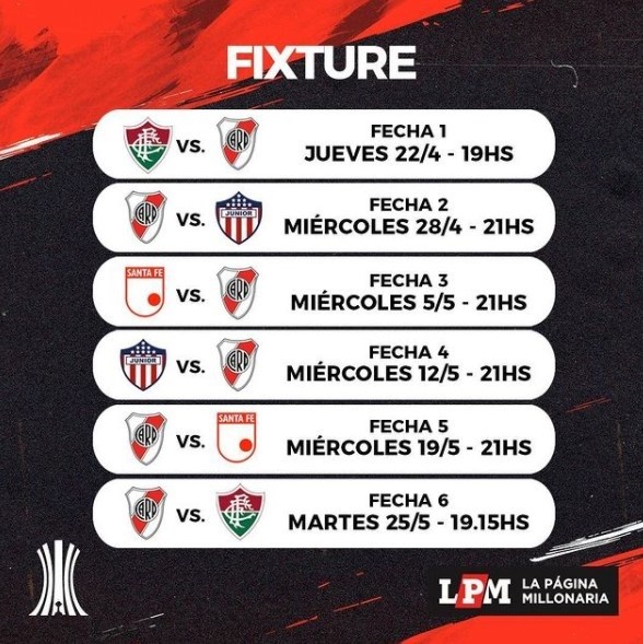 En la edición actual participarán seis clubesargentinos en esta fase: River,Boca, Racing, Defensa y Justicia, Argentinos y Vélez. El Más Grande forma parte del grupo D, junto a Fluminense de Brasil, e Independiente Santa Fe y Junior de Colombia. El debut del equipo de Marcelo Gallardo será el próximo jueves desde las 19 en el estadio Maracanáfrente al conjunto brasileño.