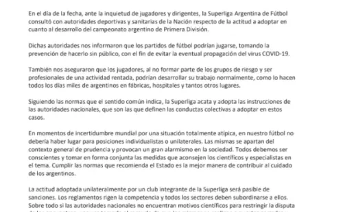 Además, explicó que en caso que el Millonario no se presente a jugar el encuentro frente a Atlético Tucumán, deberá respetar la sanción que Superliga le imponga en el futuro.