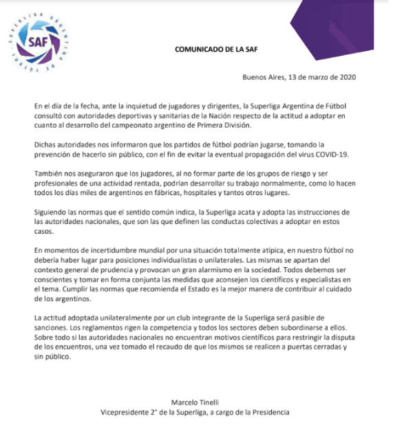 La novela de anoche sigue teniendo partes. Esta vez, le tocó responder a la Superliga. Con la firma del flamante presidente del órgano que regula torneo, Marcelo Tinelli, salió un comunicado oficial explicando que el Ministerio de Salud de la Nación le dio autorización para que el fútbol se juegue sin público.
