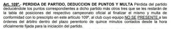 Según el reglamento de la AFA,en su artículo 109, dispone los siguiente:”Pérdida de partido, deducción de puntos y multa.Pérdida del partido deduciéndole los puntos correspondientes a dicho partido más otros tres que se les restarán de la tabla de posiciones del respectivo campeonato oficial al finalizar el mismo y multa de conformidad con lo prescripto en este artículo 109º, al club cuyo equipo no se presente a las órdenes del árbitro dentro del plazo perentorio de quince minutos contados desde la hora oficialmente fijada para la iniciación del partido”.