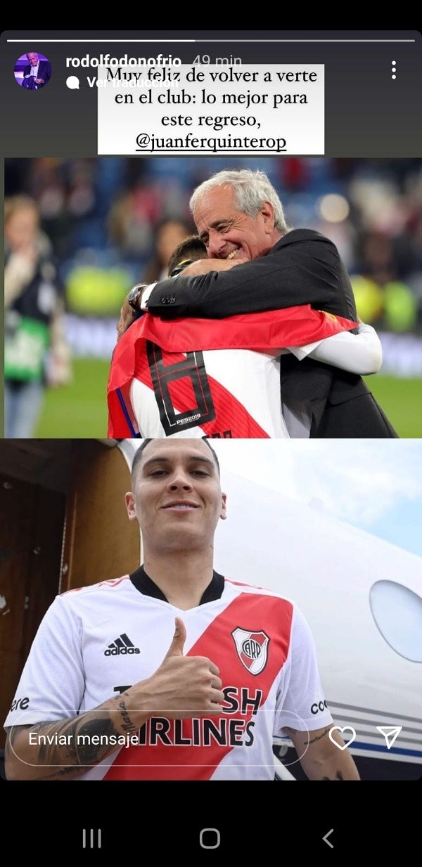 La vuelta de Juan Fernando Quintero a River solamente trajo alegría. Todos los hinchas deseaban el regreso del autor del gol más importante de la historia del club, el futbolista quería volver al lugar donde fue feliz, el cuerpo técnico está encantado con volver a contar con un futbolista de la jerarquía de Juanfer y quien también se alegró fue Rodolfo D’Onofrio, ex presidente del club que el pasado mes de diciembre entregó el mando a Jorge Brito –su vicepresidente en ambas gestiones- y puso fin a 8 años como máximo mandatario de River.