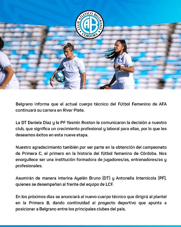 La noticia de la llegada de Díaz a River estalló primero en Córdoba y generó un revuelo importante. Daniela Díaz y Yasmín Rostón eran las entrenadoras de Belgrano hasta hace unas horas y su salida provocó mucho enojo en los hinchas cordobeses. Díaz, también ex jugadora del Pirata, Racing y UAI Urquiza, veníade ascender al equipo de la Primera C a la Primera B en un campañóny a días de que comience el campeonato, recibieron el llamado del Millonario y optaron por dar el salto hacia la Primera División.