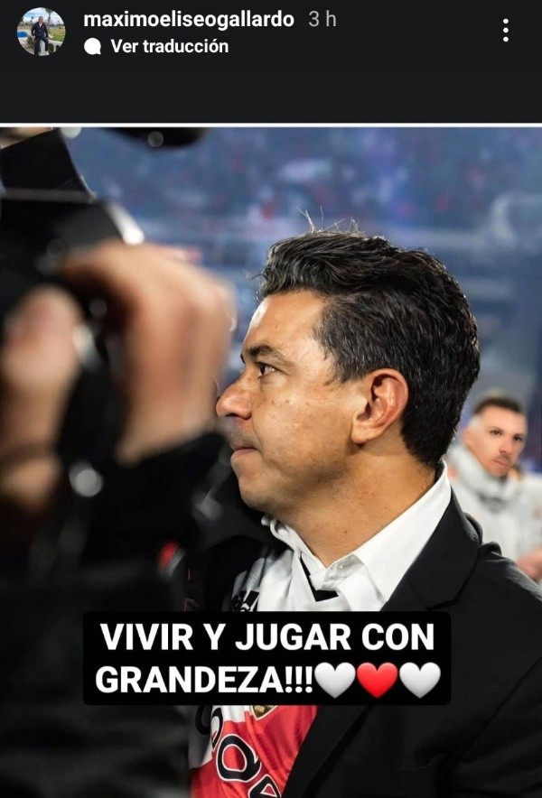 Dos personalidades importantes dentro de su vida (uno en la personal y otra en la laboral) respaldaron a morir lo hecho por sus jugadores y así lo hicieron saber en redes sociales. El primero fue su papá Máximo, que subió una foto de su hijo mirando a los hinchas en el Monumental junto con el actual lema de River que aplica para lo sucedido ayer: “Vivir y jugar con grandeza!!!”.