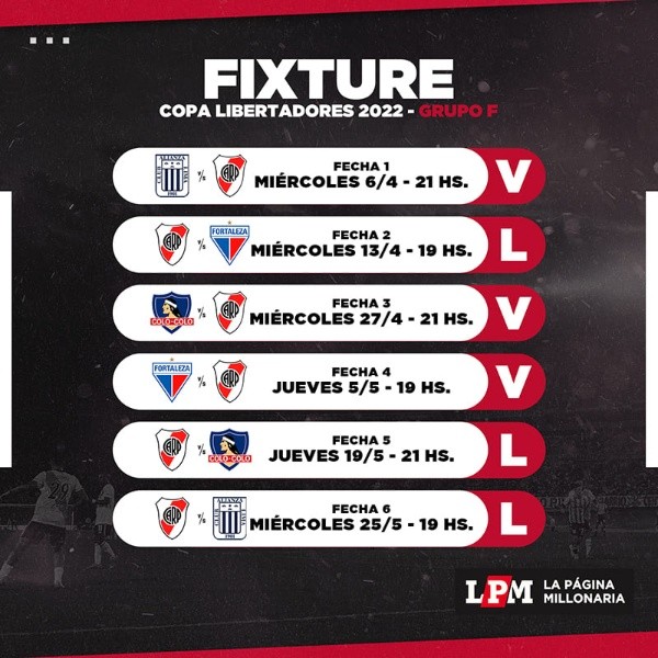 Este sábado la Conmebol dio a conocer qué días y en qué horario se jugarán los partidos de la fase de grupos. El Millonario comenzará su camino en Lima ante Alianza Lima por la primera jornada, luego recibirá a Fortaleza en el Monumental, la tercera jornada será contra Colo Colo en Santiago, ya por la cuarta fecha viajará a Brasil para enfrentar a Fortaleza y el cierre será con dos partidos de local: el primero ante Colo Colo y el último contra Alianza Lima.
