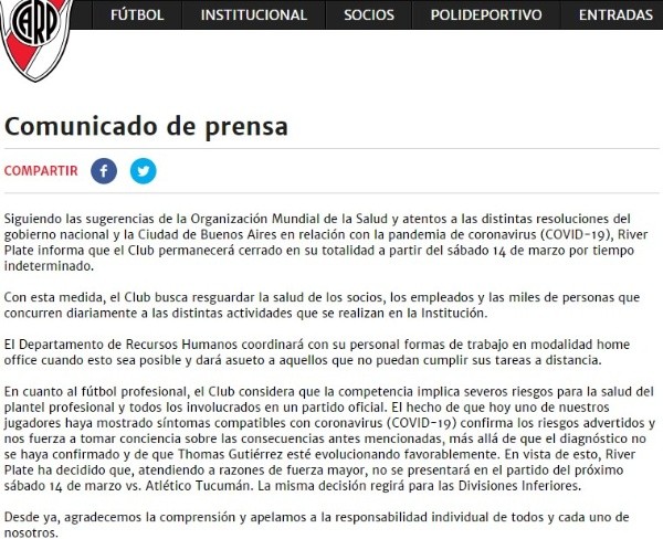 Tres días más tarde, River debía disputar el comienzo de la Copa de la Superliga, también en el Monumental, ante Atlético Tucumán. Pero allí el club tomó una fuerte decisión en la que el tiempo le iba a dar la razón. Debido a los riesgos de contagio por el coronavirus, el viernes 13 de marzo se emitió un comunicado oficial donde se informaba el cierre total de la institución y la no presentación del equipo ante los tucumanos, que debía jugarse el otro día.