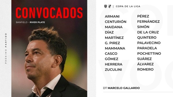 El Millonario quiere seguir apuntando a todos los frentes. Por eso, este domingo jugará otro partido clave para seguir apostando a la competencia local. El equipo de Marcelo Gallardo visitará a Banfield desde las 21.30 horas en el estadio Florencio Sola en busca de tres puntos que le permitan saltar a la primera posicion de la Zona A. De cara a este partido, el Muñeco decidió convocar a 22 futbolistas.